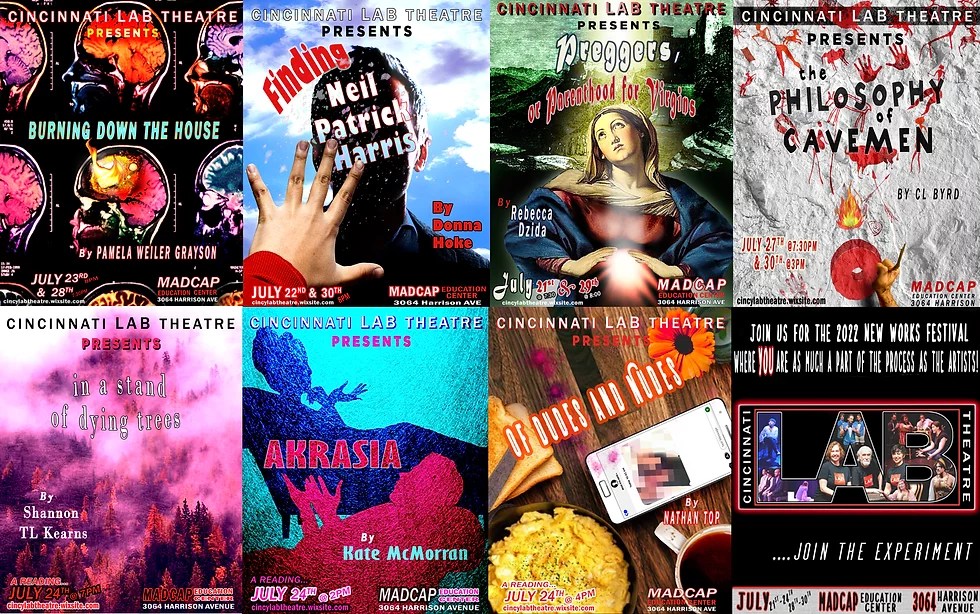 Cincinnati LAB Theatre, New Works Festival | 7:30 p.m. Madcap Education Center, 3064 Harrison Ave., Cincinnati, OH 45211. DETAILS: This two-weekend exploration of new theater kicks off with a performance of “Preggers, Or Parenthood For Virgins” by Rebecca Dzida, one of three brand new fully staged workshop productions. There is also a play reading series and a preview (July 27) of a new work to appear in this year’s Edinburgh Fringe Festival. Continues through Sunday and then next Thursday through Saturday in rotating repertoire.